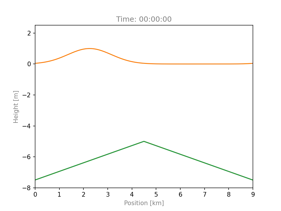 As a toy problem, let us analyze a simplified version of the shallow water equations (a.k.a. Saint-Venant equations 2) in one dimension. Why these? Because they are simple and fun to watch! The equations are